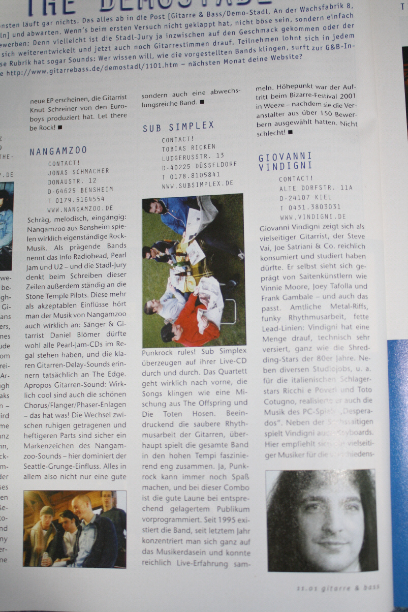 - Die Zeitung Gitarre & Bass über Giovanni Vindigni : "Giovanni Vindigni zeigt sich als vielseitiger Gitarrist, der Steve Vai, Joe Satriani & Co. reichlich konsumiert und studiert haben dürfte. Er selbst sieht sich geprägt von Saitenkünstlern wie Vinnie Moore, Joey Tafolla und Frank Gambale – und auch das passt. Amtliche Metal-Riffs, funky Rhythmusarbeit, fette Lead-Linien: Vindigni hat eine Menge drauf, technisch sehr versiert, ganz wie die Shredding-Stars der 80er Jahre. Neben diversen Studiojobs, u. a. für die italienischen Schlagerstars Ricchi e Poveri und Toto Cotugno, realisierte er auch die Musik des PC-Spiels „Desperados". Neben der Sechssaitigen spielt Vindigni auch Keyboards. Hier empfiehlt sich ein vielseitiger Musiker für die verschiedensten Studio- und Live-Projekte."